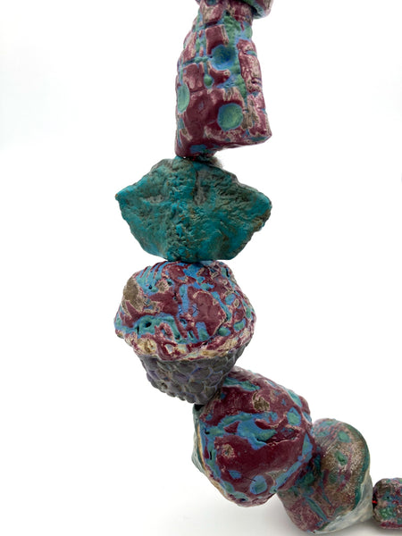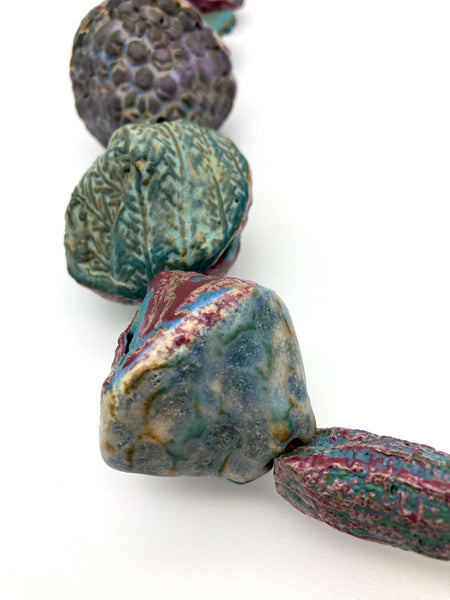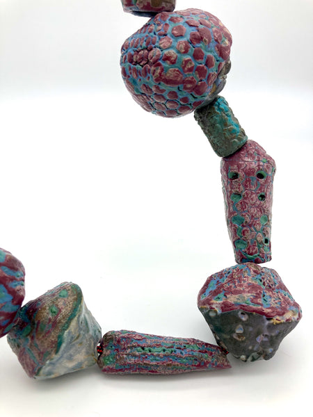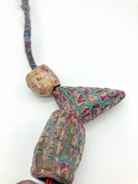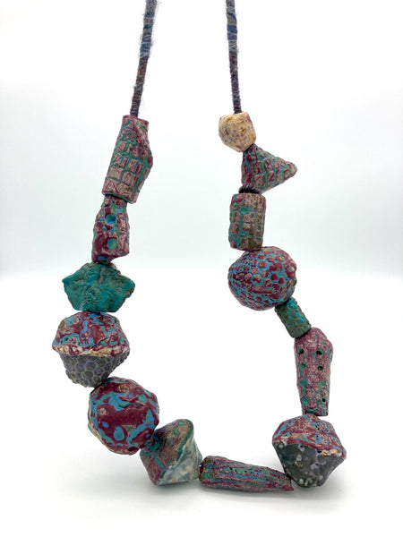 14 unique beads strung on sythetic cord, partially wrapped with handspun, felted yarn. Dimensions: roughly spherical beads: ~1.5" diameterfull loop length: ~40"length of beaded section: ~24"cord: ~1/4" diameter